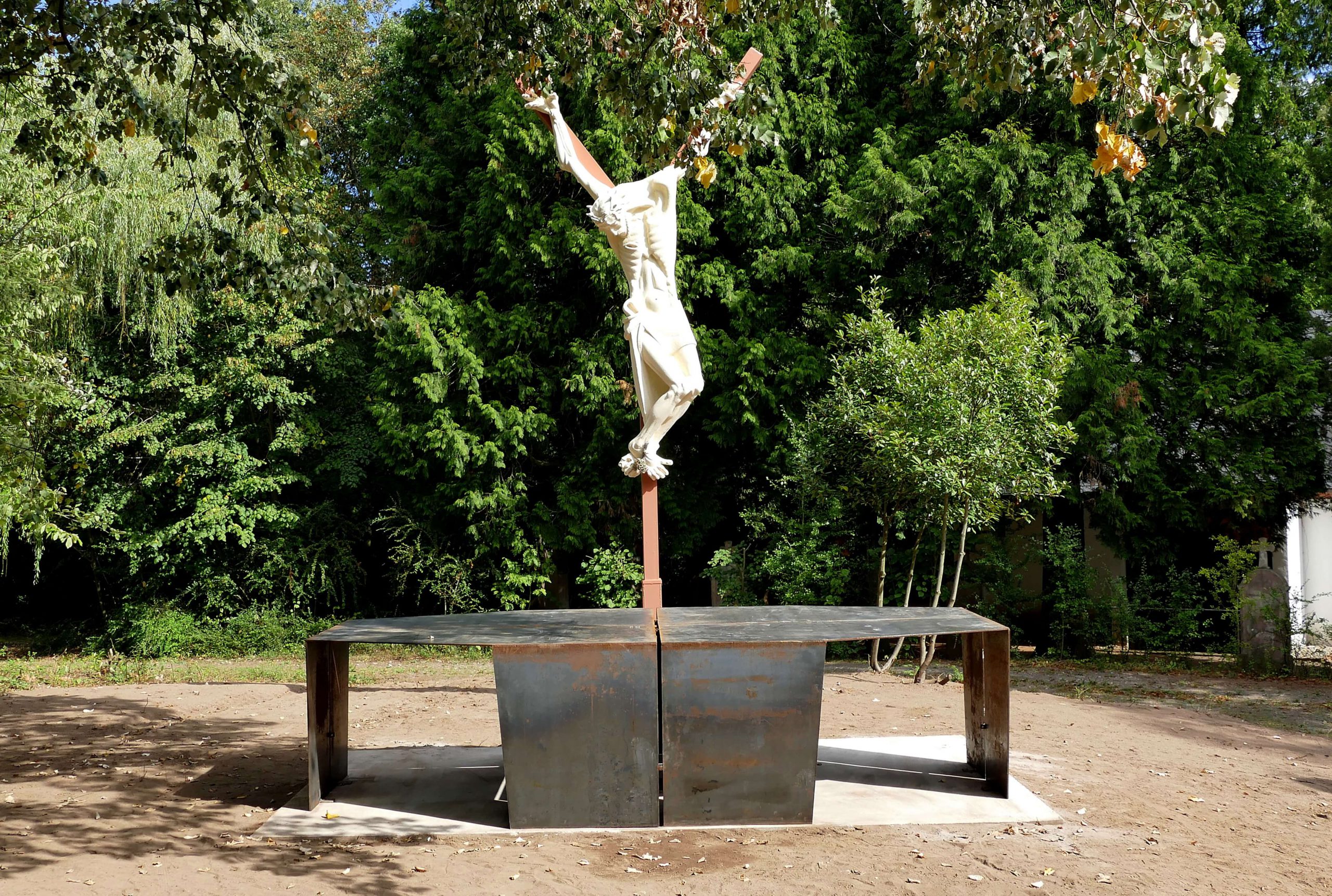 Der Altar aus Schwarzstahlplatten wurde von der Erwerbslosenselbsthilfe Püttlingen für den Deutschen Katholikentag im Jahre 2006 gefertigt und im Auftrag des Klosters Heilig Kreuz zur Zeit der Corona-Pandemie vor dem Griesenbrock-Kreuz neu errichtet.
