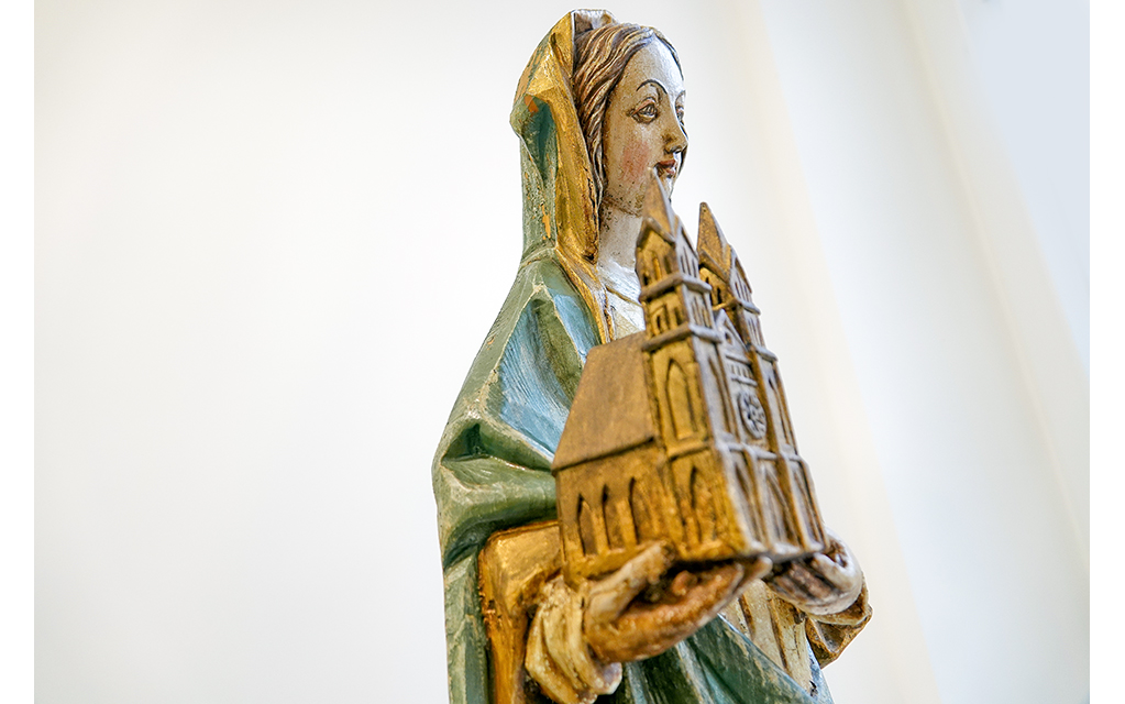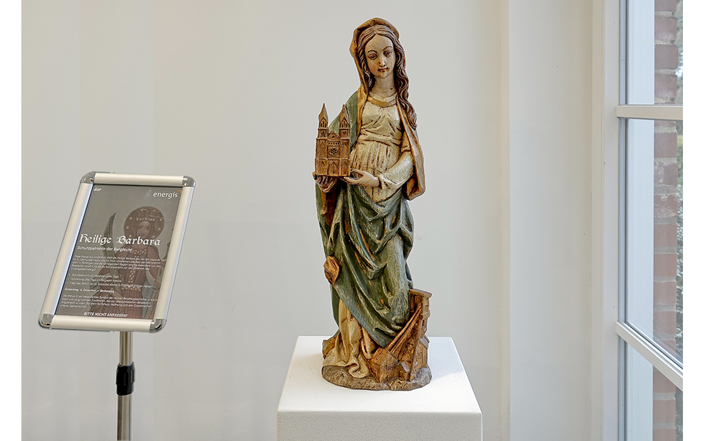 Die Statue aus Lindenholz, 75 cm groß, zeigt die heilige Barbara, mit der Kirche St. Sebastian, Püttlingen, in Händen. Am Fuß der Statue ist die Schachtanlage Viktoria dargestellt.